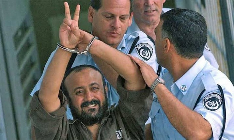 An Israeli prisoner kisses the head of a Palestinian resistance man from the Al-Qassam Brigades